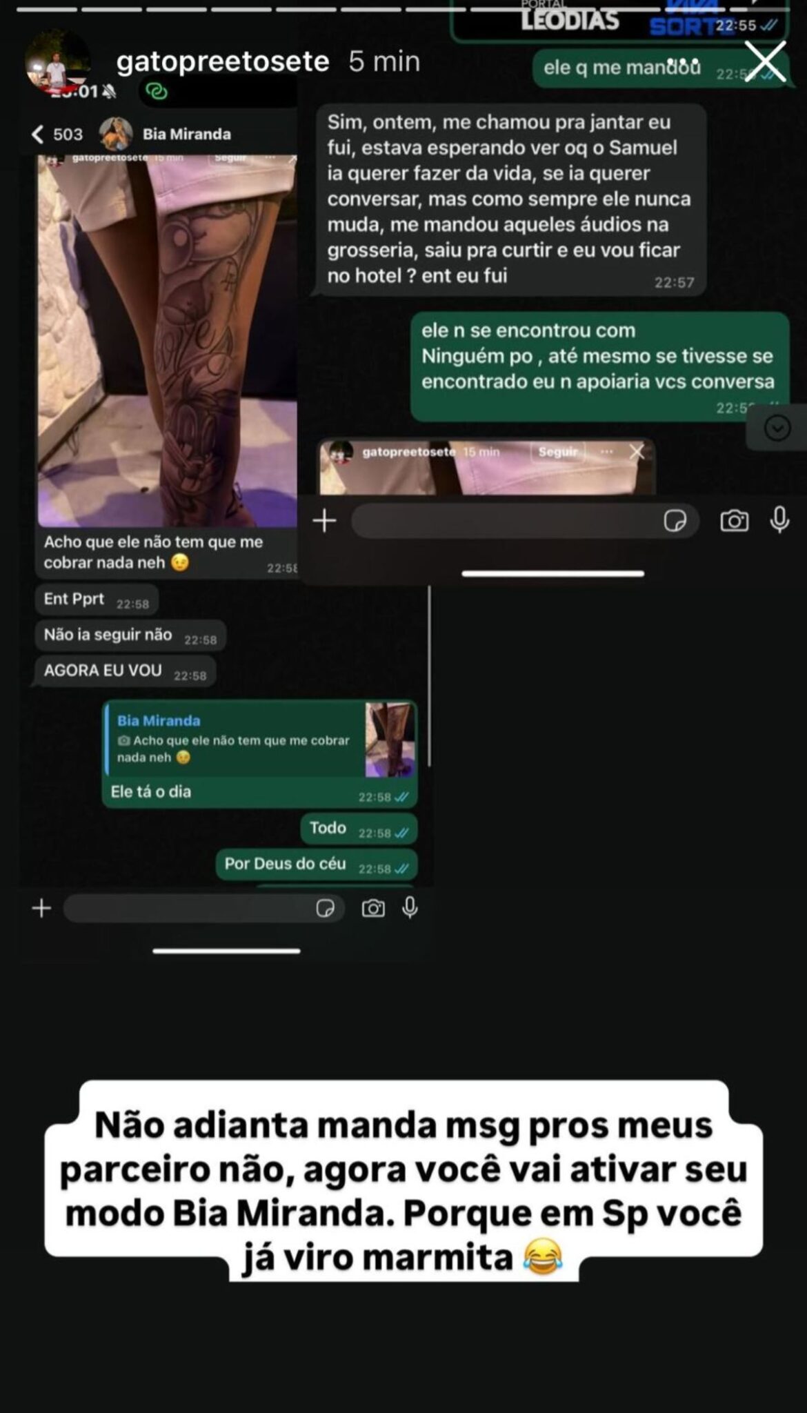 O influenciador digital Samuel Sant’Anna, conhecido como Gato Preto, reacendeu a polêmica com sua ex-namorada, Bia Miranda, após o vazamento de imagens dela jantando com o também influencer Derik Elias. Na madrugada de domingo (15/6), Gato Preto usou suas redes sociais para expor supostas mensagens enviadas por Bia a um amigo dele, nas quais ela tentava justificar o encontro com Derik, alegando estar esperando uma decisão de Samuel sobre uma possível reconciliação.