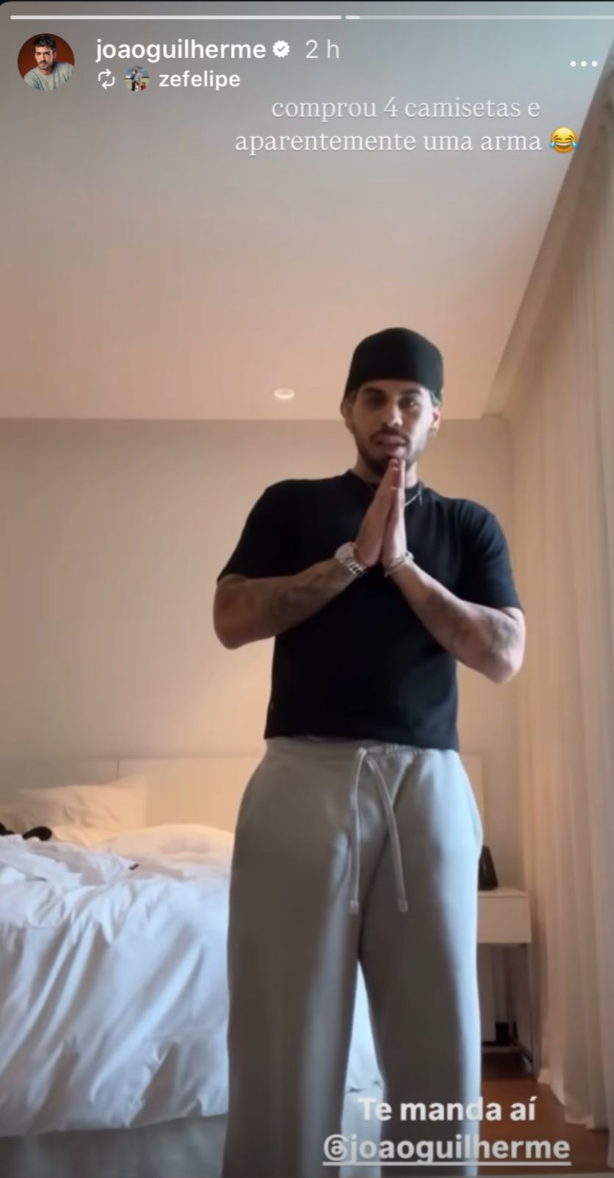João Guilherme, sempre espirituoso, não perdeu a chance de entrar na brincadeira. Em resposta ao vídeo, ele comentou com ironia: “Comprou quatro camisetas e, aparentemente, uma arma”, fazendo alusão ao volume na calça de Zé Felipe. A frase viralizou e foi replicada por diversos perfis, com direito a emojis sugestivos e memes.