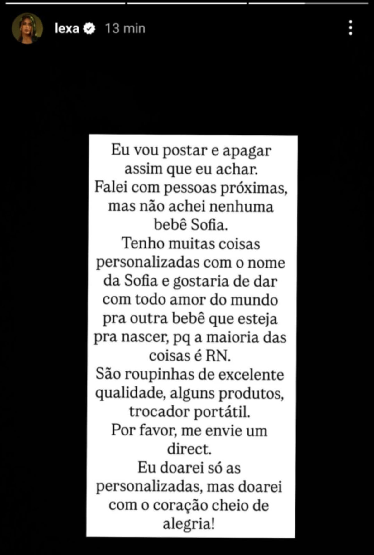 Em uma série de stories no Instagram, Lexa revelou que ainda procura por uma bebê chamada Sofia para receber as peças, que incluem roupinhas de recém-nascido, trocador portátil e outros itens de alta qualidade, todos personalizados com o nome da filha falecida. “Gostaria de dar com todo amor do mundo para outra bebê que esteja para nascer”, disse a artista, emocionada. “Doarei com o coração cheio de alegria”, completou.