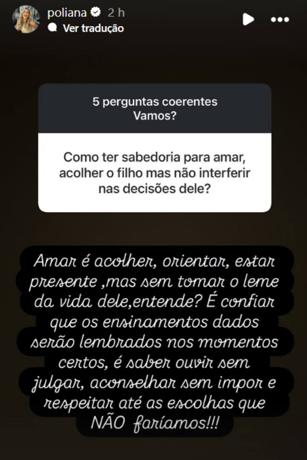 A seguidora perguntou: “Como ter sabedoria para amar, acolher o filho, mas não interferir nas escolhas dele?”. Poliana respondeu com um texto profundo: “Amar é acolher, orientar, estar presente, mas sem tomar o leme da vida dele, entende? É confiar que os ensinamentos dados serão lembrados nos momentos certos, é saber ouvir sem julgar, aconselhar sem impor e respeitar até as escolhas que NÃO faríamos!!!”.