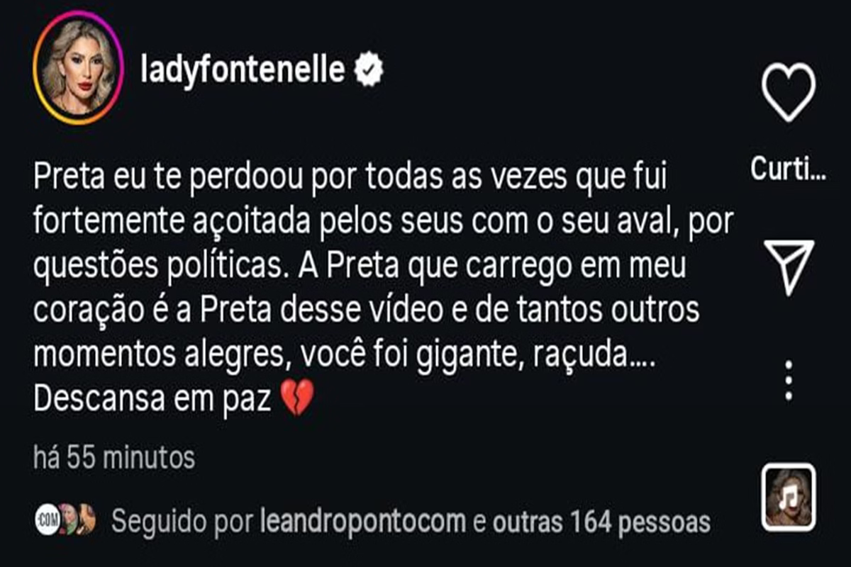 A polêmica se soma a outras reações controversas envolvendo figuras públicas após a morte da cantora, como o vídeo publicado por Antonia Fontenelle, que também dividiu opiniões. A comoção em torno da despedida de Preta Gil mostra não apenas o impacto de sua ausência, mas também o quanto sua figura pública permanece potente — até mesmo em meio ao luto.