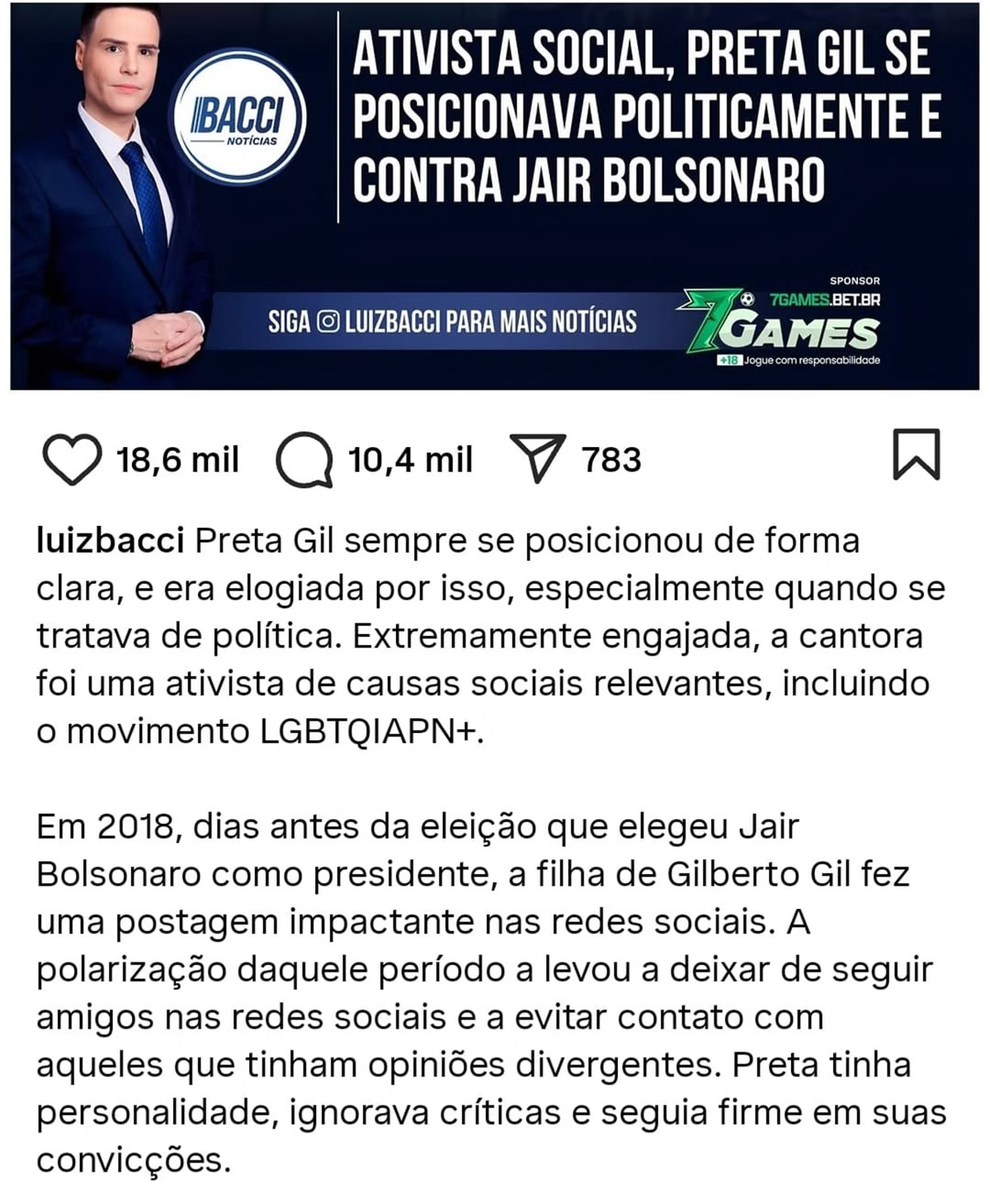 O jornalista relembrou, em seu perfil no Instagram, o posicionamento político da artista, destacando seu apoio ao ex-presidente Lula e seu ativismo em causas sociais, como os direitos LGBTQIAPN+. A postagem trazia uma imagem de Preta Gil fazendo o gesto de “L” com as mãos, símbolo associado à campanha de Lula. Bacci escreveu que a cantora era firme em suas convicções e que chegou a se afastar de amigos com opiniões políticas divergentes durante o período de polarização em 2018.
