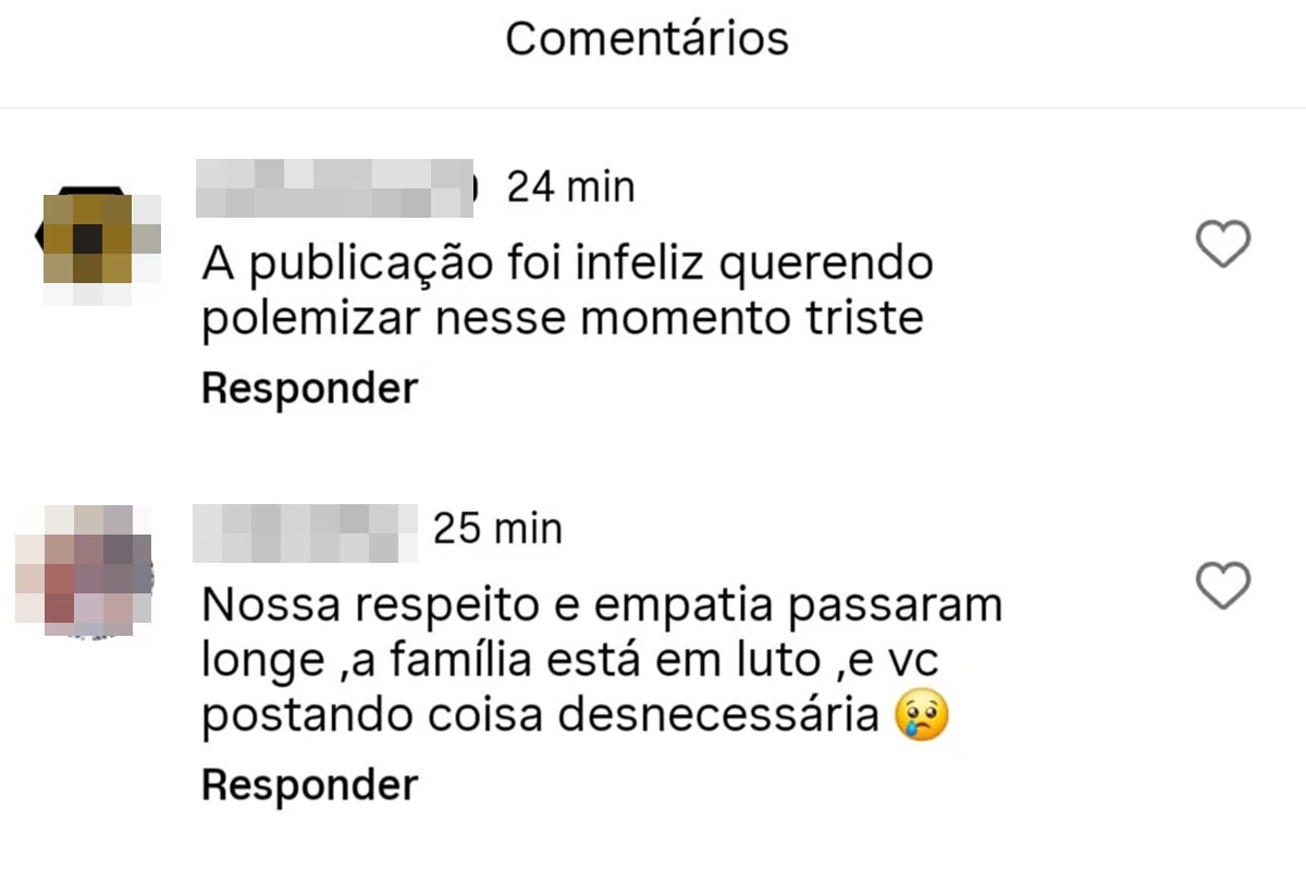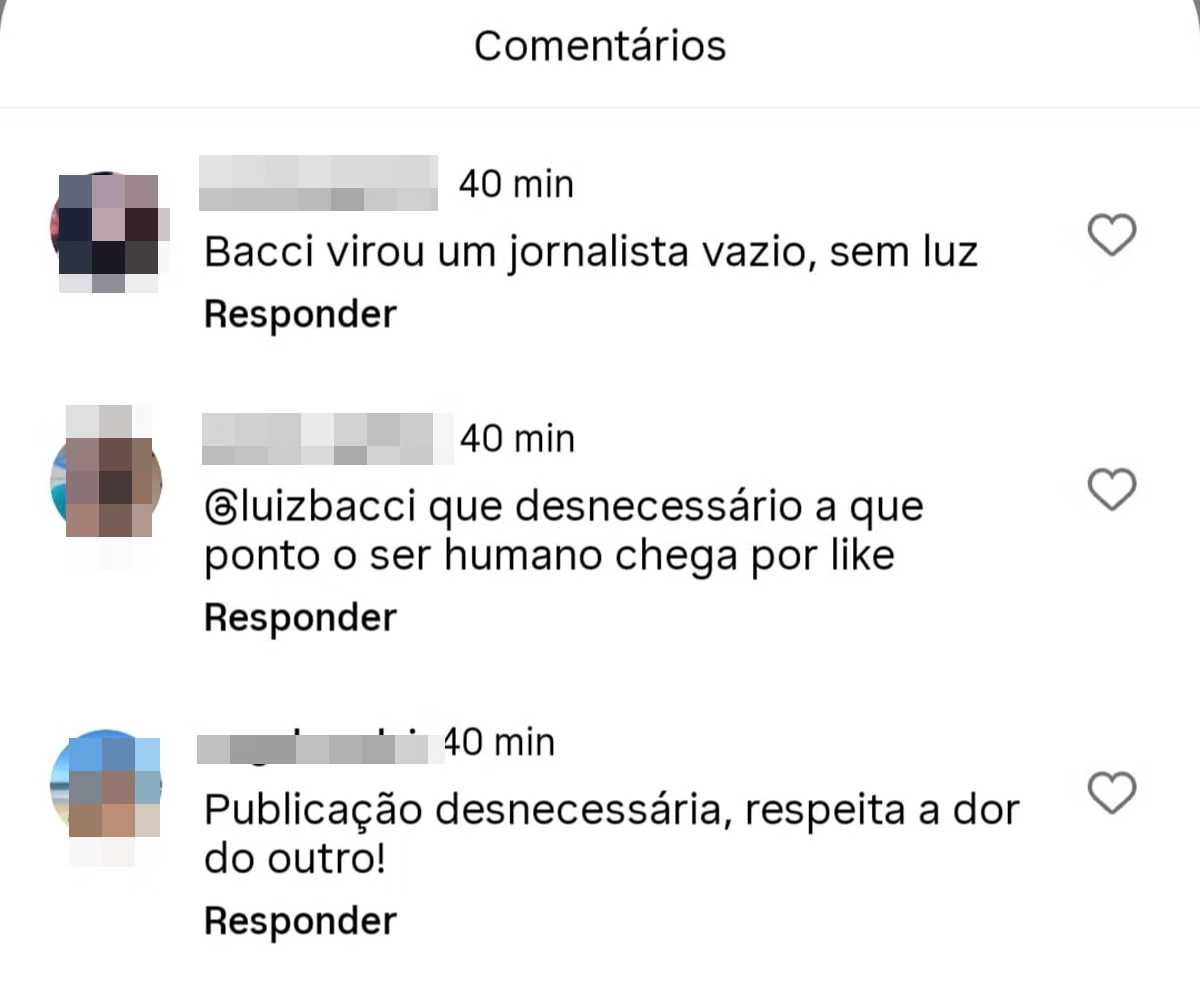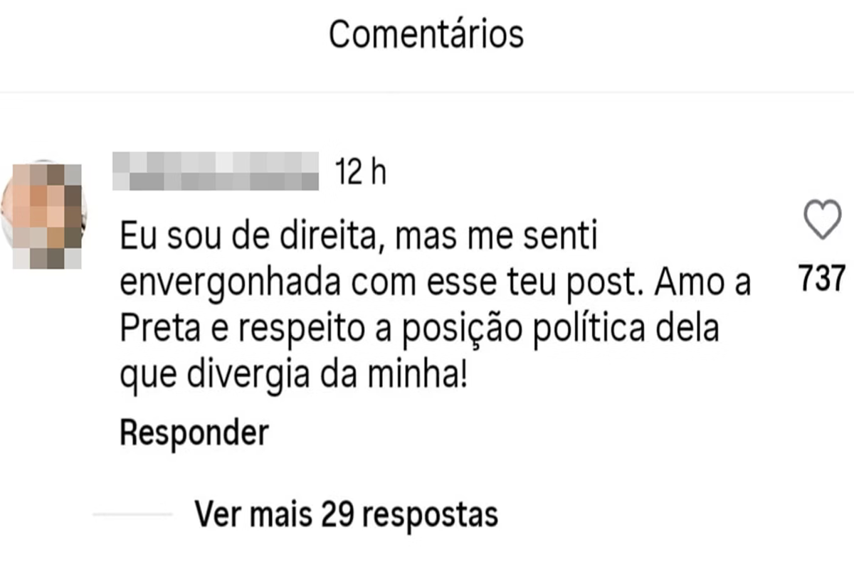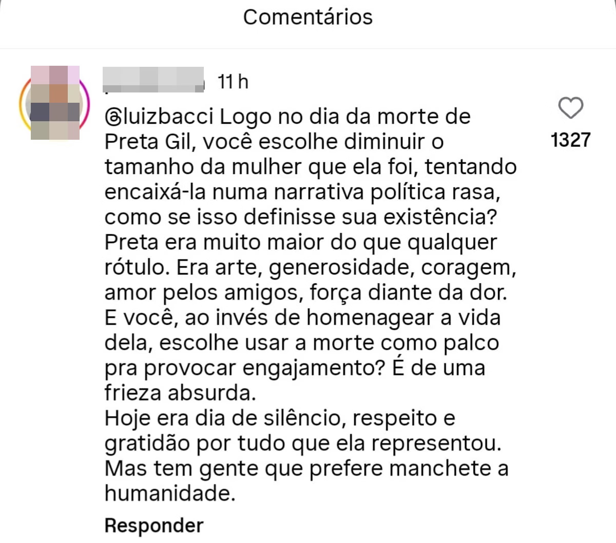 A publicação, feita no mesmo dia da morte da artista, foi vista por muitos como insensível e oportunista. Internautas acusaram Bacci de tentar usar o falecimento de Preta para gerar engajamento, reduzindo sua trajetória a uma narrativa política. “Hoje era dia de silêncio, respeito e gratidão por tudo que ela representou. Mas tem gente que prefere manchete a humanidade”, criticou um seguidor. Outros comentários reforçaram a indignação: “Sou de direita, mas me senti envergonhada com esse teu post”, disse uma usuária. “Bacci virou um jornalista vazio e sem luz”, disparou outro.