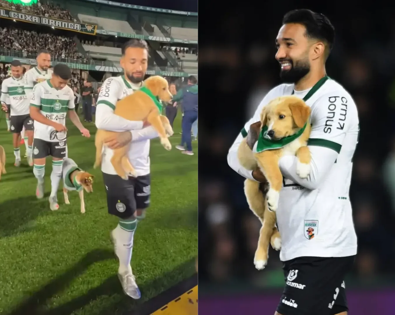 Time entra em campo com 11 cães caramelo para incentivar adoção: “Todos aguardando a chance de encontrar um lar”