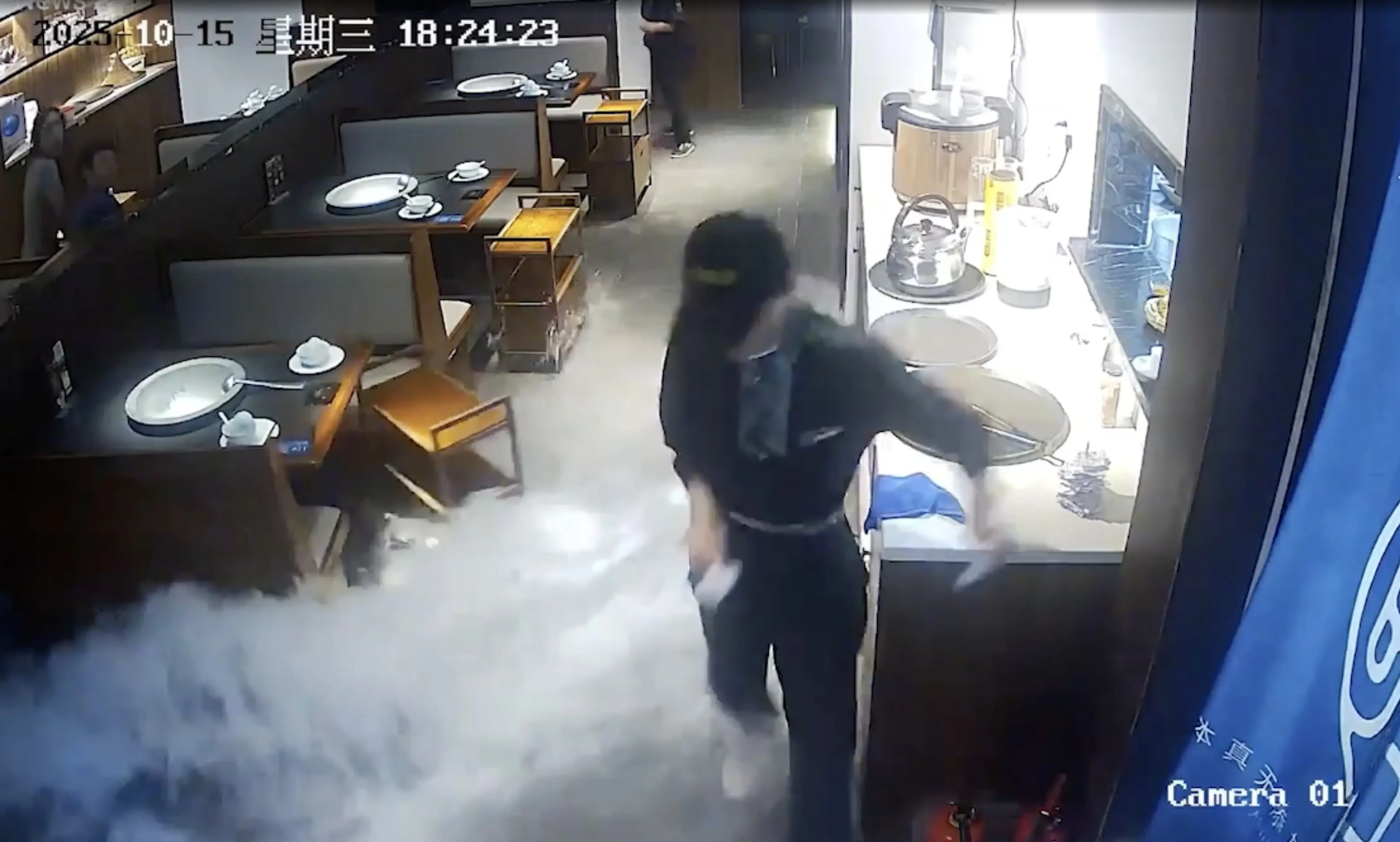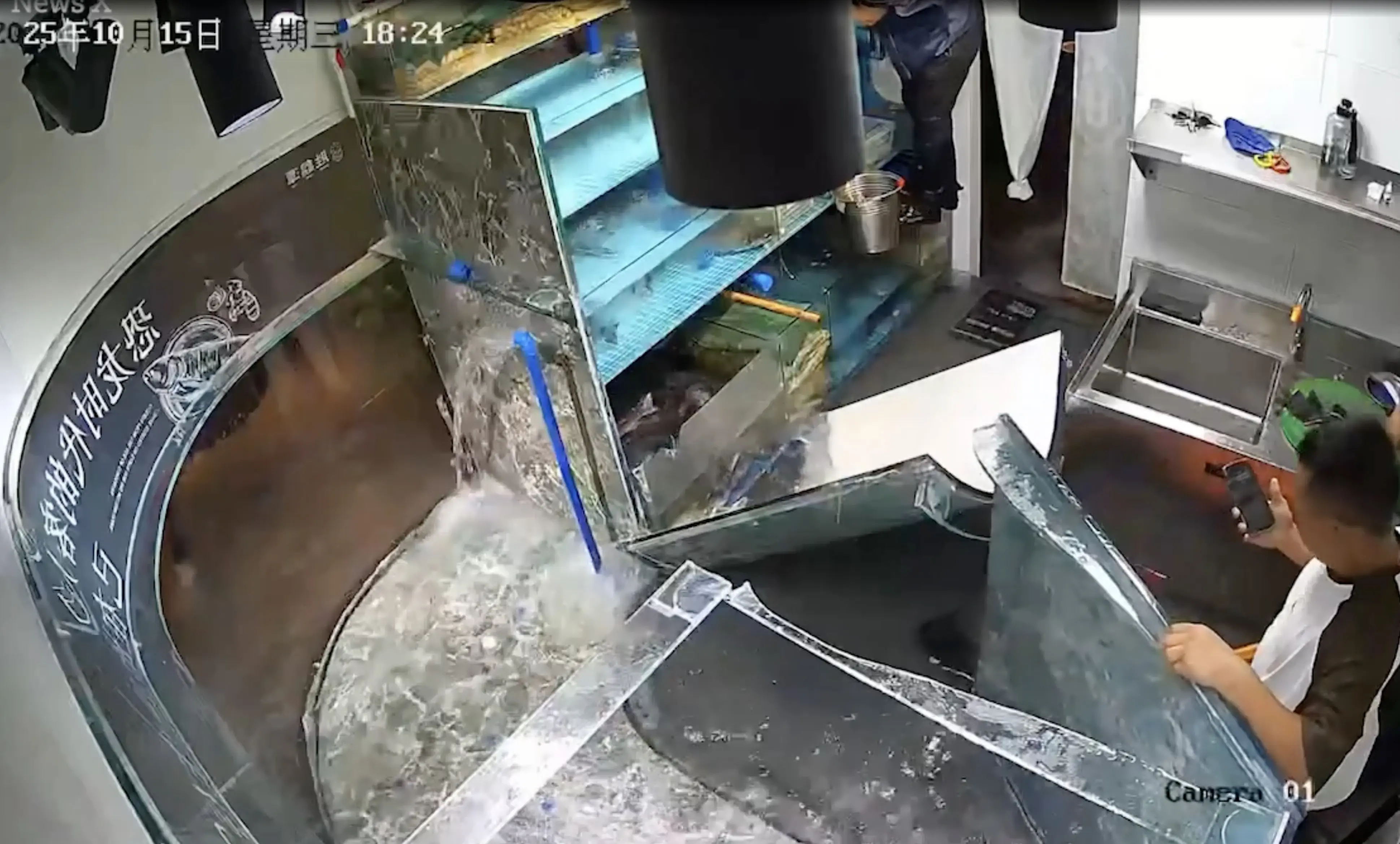 Um restaurante chinês foi palco de uma cena impressionante quando o aquário de grande porte instalado no local se rompeu subitamente, liberando uma enxurrada de água e peixes vivos pelo salão de refeições. O momento foi registrado em vídeo e mostra funcionários surpresos sendo pegos de surpresa pela força da água que invadiu o ambiente.