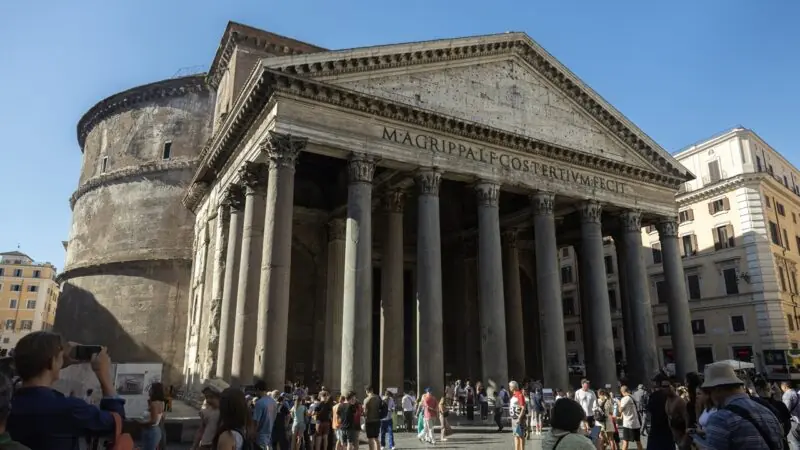 O Panteão, erguido sob o governo do imperador Adriano, é uma das construções mais icônicas da Roma Antiga, famoso por sua cúpula com um óculo central que permite a entrada de luz natural. Em 2023, o governo italiano passou a cobrar uma taxa de cinco euros para entrada, medida que, embora polêmica, não reduziu o número de visitantes.