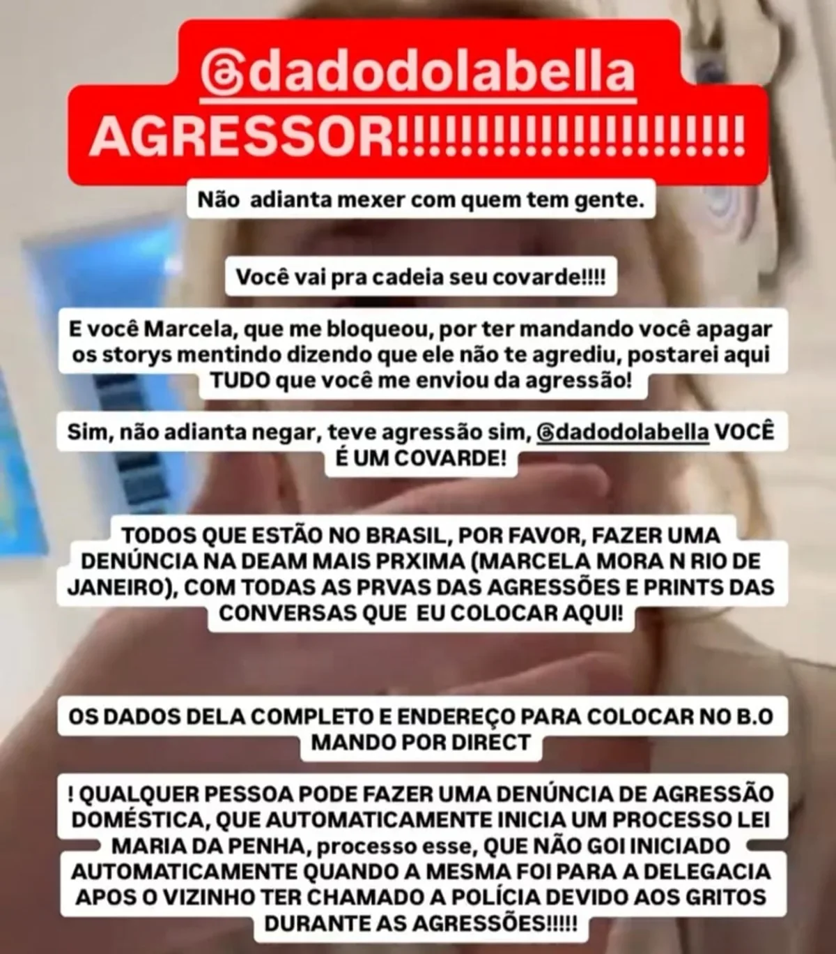 A publicação gerou forte repercussão, e o conhecido da modelo incentivou os seguidores a denunciarem o caso à Delegacia Especial de Atendimento à Mulher (Deam), ressaltando que Marcela reside no Rio de Janeiro. Ele ainda afirmou que a agressão realmente aconteceu e classificou Dado como “covarde”.