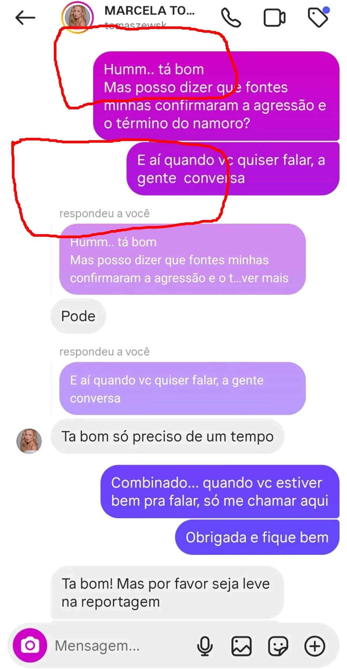 Após negar publicamente ter sido agredida por Dado Dolabella, novas imagens de Marcela Tomaszewski circulam nas redes sociais, mostrando a modelo com marcas vermelhas no pescoço e na mão. As fotos foram divulgadas por uma pessoa próxima ao casal, que criticou duramente o ator e afirmou ter sido bloqueada por Marcela depois de pedir que ela apagasse stories em que desmentia a agressão.